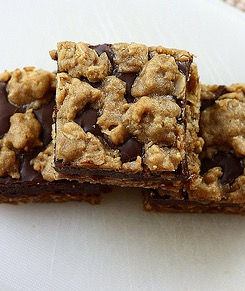 Grease a 9x9 pan with cooking spray. Heat a medium sauce pan and melt butter. Stir in brown sugar, applesauce, and vanilla. Mix in oats and cook on low heat for 2-3 minutes or until well blended. Put half mixture into pan and press down until spread evenly. Melt chocolate chips and peanut butter in small pan over low heat stirring frequently. Pour over oat mixture and spread evenly. Press the remaining oat mixture gently over the chocolate. Cover pan and refrigerate 2-3 hours or for best results overnight. Remove from refrigerator and allow to heat to room temperature before cutting and serving. Enjoy!